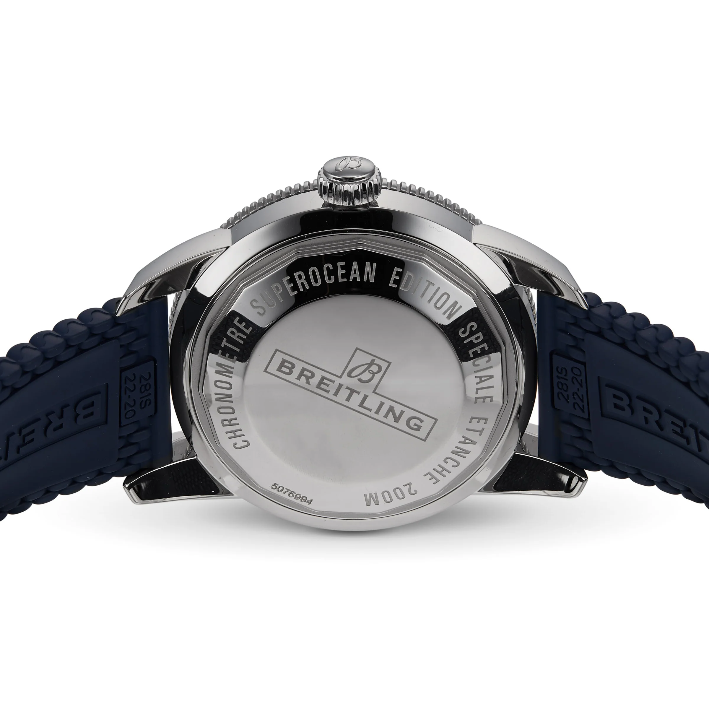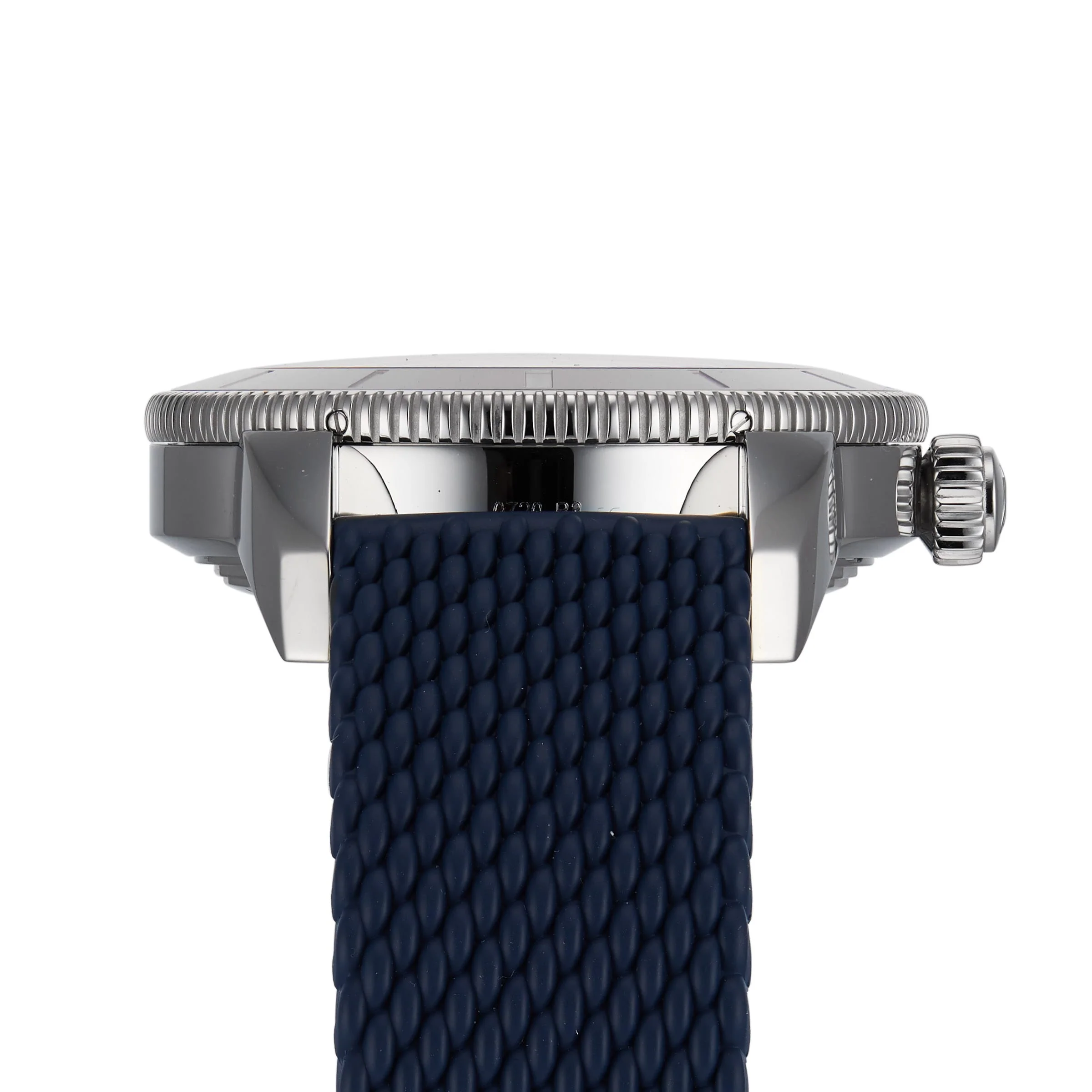 Enhances performance and style Water resistant up to 20 bar (200 metres) A 44mm stainless steel case with a blue, mesh-style rubber bracelet Powered by the Breitling 20 calibre movement Luminescent hands and indexes for increased readability AN ELEGANT DIVER’S WATCH Designed for those seeking serious performance and contemporary style, the Superocean collection provides lifesaving needs underwater. Inspired by the original 1950s Superocean, the Superocean Heritage collection unites iconic design elements with a modern touch. A true embodiment of style at sea, these models are characterised by triangular-shaped hands, and a unidirectional bezel with a polished ceramic ring. The perfect companion for all water-based pursuits, the Superocean models offer water resistance up to 200 metres (660 feet) and luminescent hands and indexes for increased readability. DECLARED EXCELLENCE A chronometer certified by COSC, this 44mm stainless steel model is presented on a blue rubber, mesh-style bracelet for elevated elegance. A ceramic unidirectional bezel frames the blue dial for maximum safety and underwater performance. Driven by the in-house Breitling 20 calibre movement, this exceptional timepiece offers unrivalled power and precision. Take this watch surfing, swimming, or diving, and then to dinner in the evening.