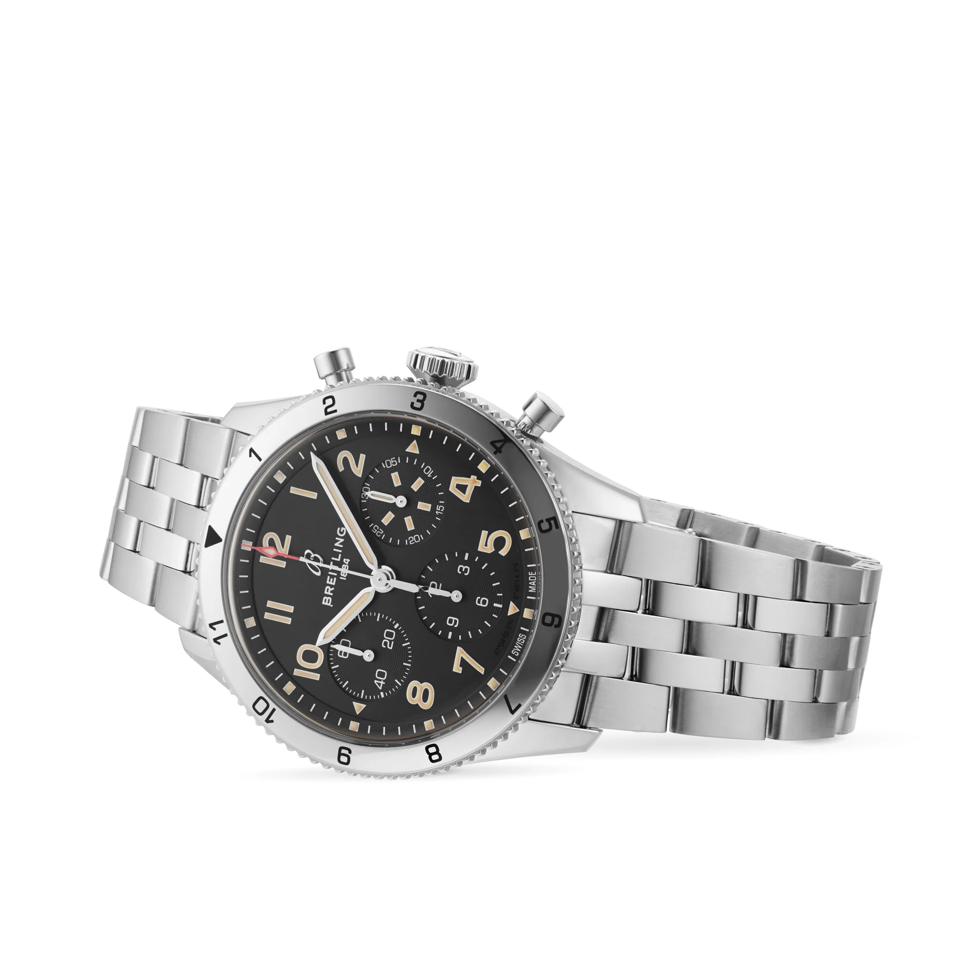 Classic AVI - Breitling's tribute to legendary aircraft Inspired by the spirit of early aircraft and the design of the P-51 Designed to withstand the rigors of a vintage cockpit Black dial framed by a knurled bezel Driven by the COSC-certified Breitling Calibre 23 movement with 48 hours of power reserve AVIATION HERITAGE The Classic AVI is a celebration of aviation history with designs inspired by four legendary aircraft. This P-51 Mustang model honours the P-51, which was built in just 120 days and became a true powerhouse of the aviation world. With low-drag wings and an engine cooling system, the revolutionary aircraft had unprecedented speed and range, while the Merlin engine allowed incredible performance even at high altitudes. A true pilot's watch, the Mustang timepiece offers optimal grip for operation by gloved hands, sizeable numerals that can be spotted with ease, and an additional hand indicating a second time zone. A WATCH FOR ADVENTURERS A chronometer certified by the COSC, this 42mm stainless steel model is presented on co-ordinating steel bracelet. Framed by a knurled bezel, the black dial presents gold hands, highly legible Arabic numerals, a date display, and three chronograph sub-dials. The Breitling Calibre 23 movement provides power and precision to this exceptional timepiece.